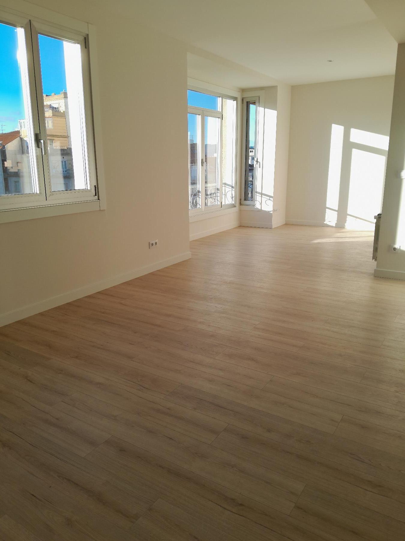 Porcelánico, el resto de la vivienda tiene tarima flotante multicapa con acabado de roble natural europeo, además de rodapié placado en blanco o a juego con la tarima.